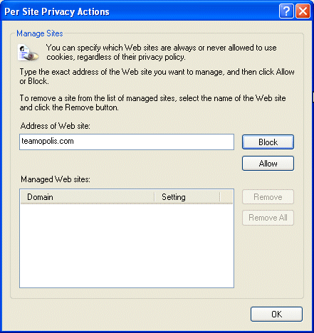 10. Make sure you have entered in teamopolis.com correctly into the edit box, and click the Allow button. The site you have just entered should be now shown in the Managed Web Sites listbox.